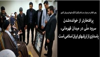 رهبر انقلاب تجلیل از ورزشکارانی را که به طور علنى در میدان قهرمانى از ارزشها پاسدارى میکنند، با ارزش خواندند و گفتند: یکى از کارهای لازم، تجلیل از ورزشکارانی است که اسم خدا را مى آورند و یا بعد از آنکه در رقابت پشت حریف را به خاک می رسانند سجده میکنند.