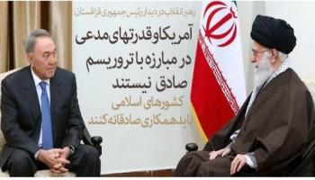 حضرت آیت الله خامنه ای رهبر معظم انقلاب اسلامی در دیدار آقای «نورسلطان نظربایف» رئیسجمهوری قزاقستان با اشاره به ضرورت افزایش همکاریهای دو کشور در زمینههای مختلف سیاسی، اقتصادی، بین المللی و مبارزه با تروریزم خاطرنشان کردند: برخی قدرتها بهویژه امریکا در ادعای مبارزه با تروریزم صادق و جدی نیستند اما کشورهای اسلامی میتوانند با همکاریهای صادقانه، این تهدید را از جهان اسلام دور کنند.