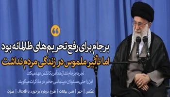 حضرت آیتالله خامنهای، گذشت بیش از شش ماه از آغاز اجرای توافق هستهای را یادآور شدند و سؤال کردند: مگر بنا نبود تحریمهای ظالمانه رفع شود تا در زندگی مردم اثر بگذارد؛ آیا پس از شش ماه هیچ تأثیر ملموسی در زندگی مردم دیده میشود؟ اگر نقض عهد آمریکاییها نبود آیا دولت نمیتوانست در این مدت کارهای فراوانی انجام دهد؟