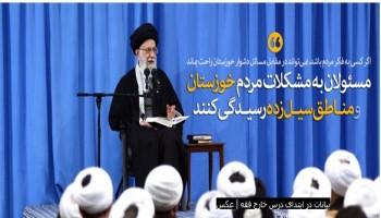 حضرت آیتالله خامنهای رهبر معظم انقلاب اسلامی در ابتدای جلسهی درس خارج فقه با اشاره به مشکلات و خسارتهای شدید پدید آمده در اثر سیل و گرد و غبار در مناطق جنوب کشور، تأکید کردند: این حوادث حقیقتاً دل انسان را میخراشد و مسئولان موظفند که با فکر و کار و تلاش و همدلی با مردم، به این مشکلات رسیدگی و برای علاج قطعی آنها چارهاندیشی و اقدام کنند.