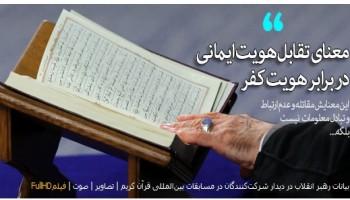 حضرت آیت الله خامنهای رهبر معظم انقلاب اسلامی در دیدار اساتید، قاریان و حافظان برگزیده سی و چهارمین دوره مسابقات بینالمللی قرآن کریم از ۸۳ کشور جهان، هویت اسلامی را مانع از دخالت و سلطه دشمنان خواندند و با اشاره به هدف جبهه کفر برای نابود کردن این هویت ایمانی خاطرنشان کردند: معارف قرآنی نجاتبخش و سازنده زندگی مقتدرانه و عزتمندانه امت اسلامی است و باید به گفتمان رایج و روشن در جوامع اسلامی تبدیل شود.