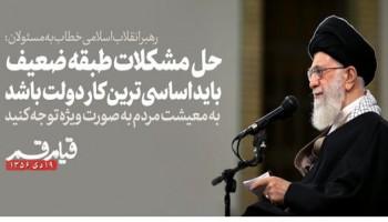 حضرت آیت الله خامنه ای در مهمترین توصیه خود به مسئولان بهخصوص دولتمردان تأکید کردند: اولویت کاری خود را حل مشکلات معیشتی مردم بهویژه قشرهای ضعیف قرار دهید، چرا که این مسئله اهمیت ویژه ای دارد.