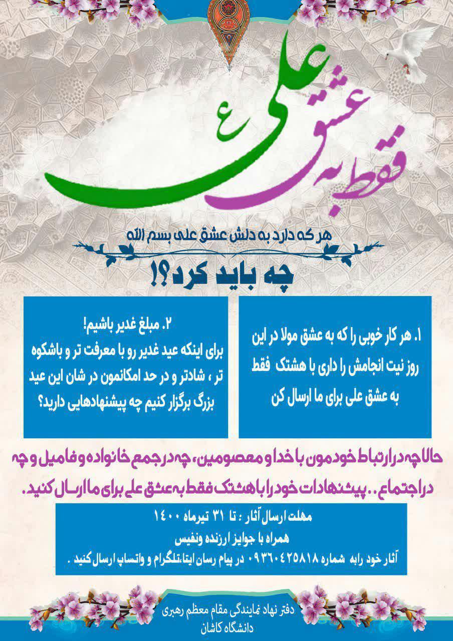 حالا چه در ارتباط خودمون با خدا و معصومین، چه در جمع خانواده و فامیل و چه در اجتماع..پیشنهادات خود را با هشتک فقط به عشق علی برای ما ارسال کنید