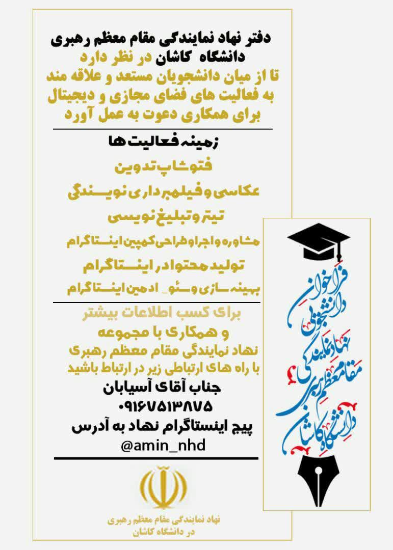 دفتر نهاد نمایندگی مقام معظم رهبری دانشگاه کاشان در نظر دارد تا ازمیان دانشجویان مستعد و علاقه مند به فعالیت های مجازی و دیجیتال برای همکاری دعوت به عمل آورد.