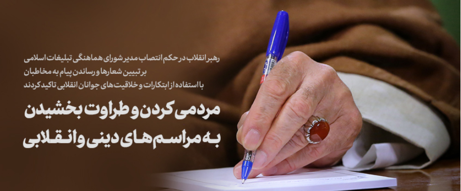 شورای هماهنگی تبلیغات اسلامی در شمار نهادهای قانونی فعال و اثرگذار در طول چند دهه و منشأ بصیرتافزائی و آرمانگرائی در بزرگداشت یادبودها و مناسبتهای انقلاب اسلامی بوده و در سایهی مدیریت موفق جناب آیتالله آقای جنتی دامت برکاته خدمات ارزشمندی به کشور کرده است. اکنون با عنایت به استعفای جناب آقای جنتی و با تشکر و تقدیر از زحمات فراوان ایشان، جناب حجتالاسلام آقای حاج شیخ محمّدحسین موسیپور دام توفیقه را به مدیریت این شورا منصوب میکنم.