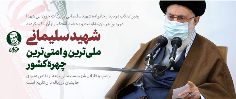 رهبر انقلاب، شهادت سردار سلیمانی را حادثهای ملی و حادثه بینالملل اسلامی برشمردند و افزودند: بزرگداشت مردمی و مبتکرانه حاج قاسم در سراسر ایران نشاندهندهی پیشرو بودن ملت در قدرشناسی از این شهید والامقام است.
