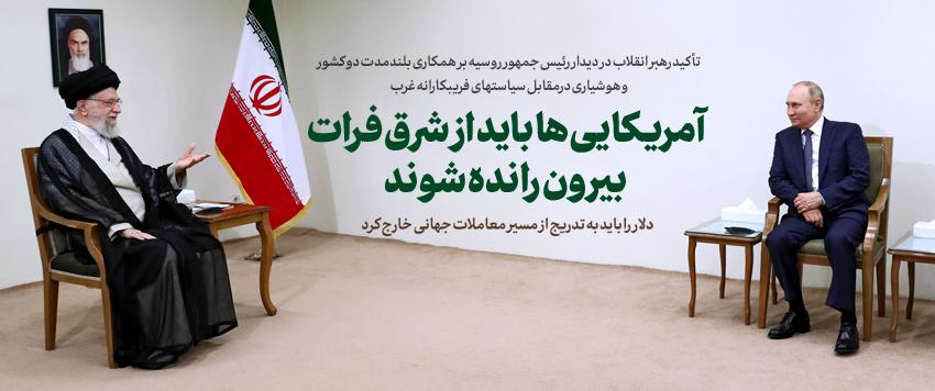 حضرت آیتالله خامنهای رهبر معظم انقلاب اسلامی عصر امروز (سهشنبه) در دیدار آقای ولادیمیر پوتین رئیسجمهور روسیه و هیئت همراه با تأکید بر ضرورت عملیاتی شدن تفاهمها و قراردادهای بین دو کشور، هوشیاری در مقابل سیاستهای فریبکارانه غرب را لازم دانستند و خاطرنشان کردند: همکاریها بلندمدت ایران و روسیه عمیقاً به نفع هر دو کشور است.