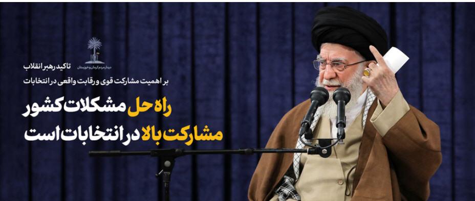 رهبر معظم انقلاب اسلامی در دیدار پرشور هزاران نفر از مردم پرافتخار استانهای خوزستان و کرمان، انتخابات ۱۱ اسفند را بسیار مهم، تعیینکننده و زمینهساز تحول خواندند و با تبیین اهمیت مجلس شورای اسلامی در حل مشکلات موجود و تعیین مسیر حرکت کشور، تأکید کردند: ملت خود را برای برگزاری انتخابات به بهترین شکل یعنی همراه با ۴ خصوصیت «مشارکت قوی و پرشور، رقابت واقعی جناحها و دیدگاههای مختلف، سلامت حقیقی و امنیت کامل» آماده کند.