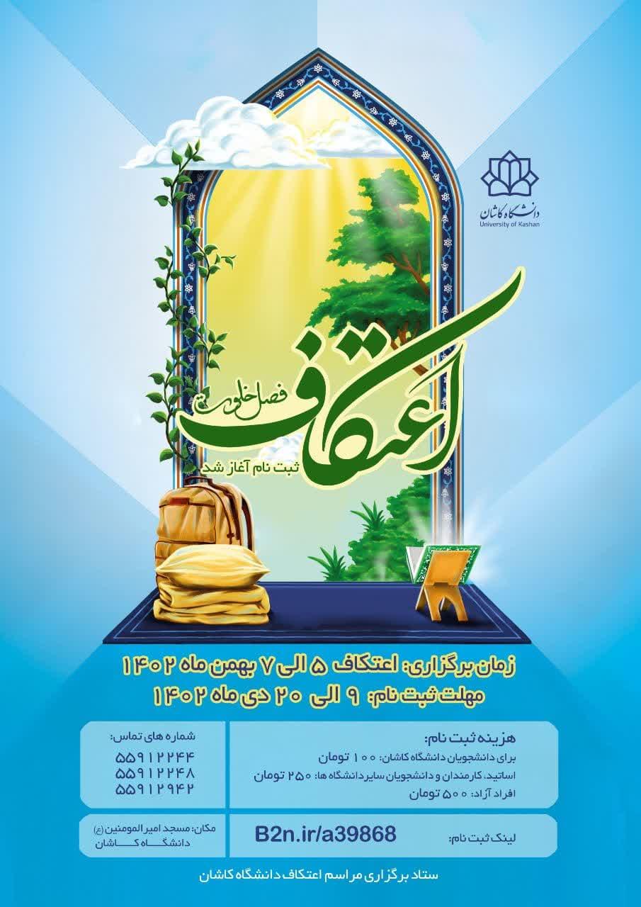 لازم به ذکر است مراسم معنوی اعتکاف از سحرگاه 5 بهمن سال 1402 مصادف با 13 رجب 1445در مسجد دانشگاه کاشان آغاز می شود. علاقه مندان می توانند جهت شرکت در مراسم اعتکاف از تاریخ 9 الی 15 دی ماه سال جاری با مراجعه به لینک B2n.ir/a39868 ثبت نام نمایند.