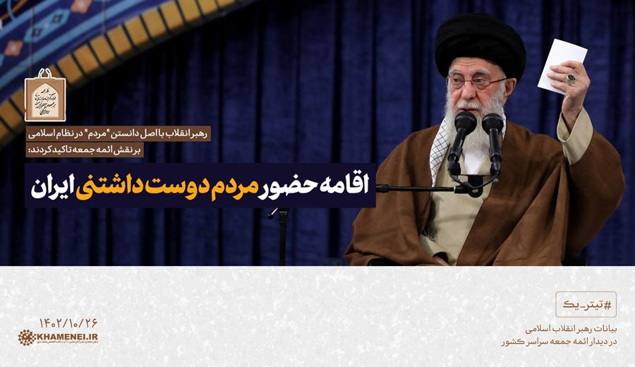 رهبر معظم انقلاب اسلامی صبح امروز در دیدار ائمه جمعه سراسر کشور، «حضور، خواست و اقدام مردم» را یک اصل اساسی در اسلام خواندند و با تحسین وفاداری، صبوری، علاقمندی، هوشمندی و فداکاری ملت ایران، گفتند: این مردم حتی با ظواهر متفاوت، مؤمنند و دلشان با خداست و باید به معنای واقعی کلمه قدر آنان را دانست و عمیقا به آنها محبت ورزید.