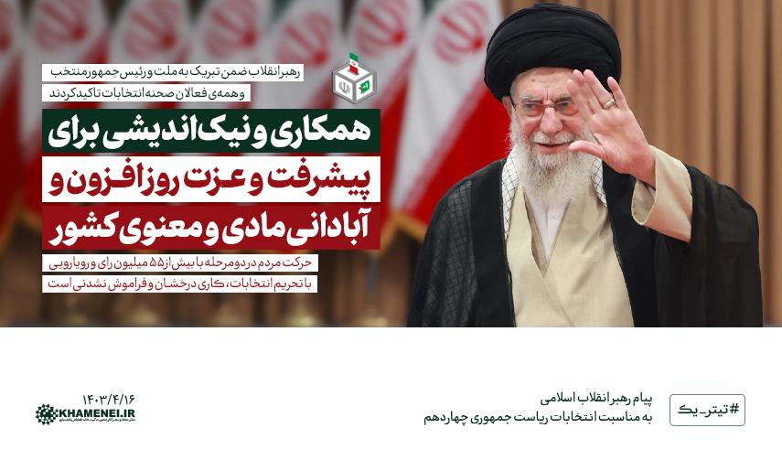 اکنون ملت ایران رئیس جمهور خود را انتخاب کرده است. اینجانب با تبریک به ملت و به رئیس جمهور منتخب و به همهی فعالان این صحنهی حساس مخصوصاً جوانان پرشور ستادهای انتخاباتی نامزدها، همگان را به همکاری و نیکاندیشی برای پیشرفت و عزت روزافزون کشور توصیه میکنم. شایسته است رفتارهای رقابتی دوران انتخابات به هنجارهای رفاقتی تبدیل شود و هر کس در حدّ توان خود برای آبادانی مادی و معنوی کشور تلاش کند.
