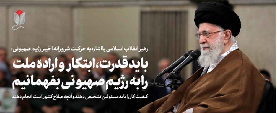 رهبر انقلاب با تأکید بر ضرورت بهم خوردن محاسبات غلط رژیم صهیونیستی درباره ایران، گفتند: آنها درباره ایران دچار خطای محاسباتی هستند چرا که ایران و جوانان و ملت ایران را نمیشناسند و هنوز نتوانستهاند قدرت، توانایی، ابتکار و ارده ملت ایران را درست بفهمند که ما باید این را به آنها بفهمانیم.
