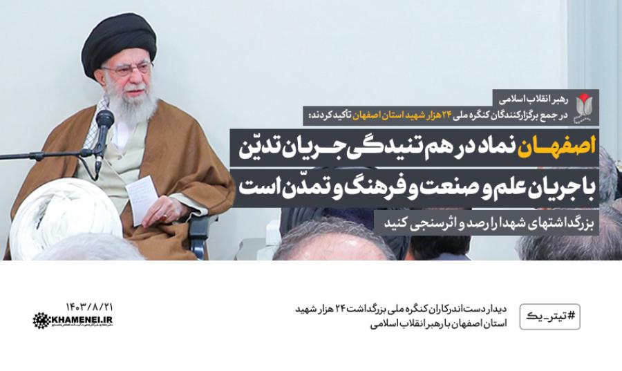 رهبر انقلاب، فهرست بلند علمای بزرگ اصفهان را نشانهای از عظمت دینداری مردم اصفهان خواندند و افزودند: برجستگی عنصر دین در اصفهان، نشاندهنده در هم تنیدگی جریان تدیّن و تشرّع با علم و صنعت و فرهنگ در تاریخ و تمدن ایرانی، و گویای این واقعیت است که تلاش برخی افراد برای تفکیک علم از دین در فرهنگ و تمدن ایران، کاری غلط و بیهوده است.