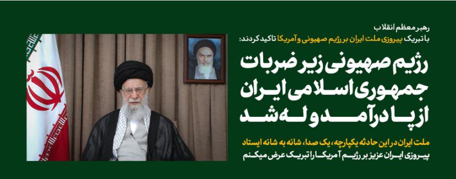 رهبر معظم انقلاب اسلامی در سومین پیام تلویزیونی به مردم، پیروزی ملت ایران بر رژیم صهیونیستی و ضربات مهلک نیروهای مسلح به این رژیم و همچنین پیروزی بر رژیم آمریکا و سیلی سخت جمهوری اسلامی به آن در برابر حمله بدون دستاورد آنها به مراکز هستهای ایران را در خور تبریک دانستند و با تأکید بر اینکه تبریک سوم، تبریک اتحاد و اتفاق فوقالعاده ملت ایران است، در خصوص اظهارات گستاخانه رئیسجمهور آمریکا مبنی بر تسلیم ایران، گفتند: این اظهارات حقیقت دشمنی آنها با ملت ایران را افشا و مشخص کرد بهانههای آنها همچون هستهای، موشکی و حقوق بشر در واقع برای پنهان کردن این واقعیت است که به کمتر از تسلیم ملت ایران راضی نمیشوند. البته ملت ایران همواره عزیز و پیروز است و هرگز چنین اتفاقی نخواهد افتاد و این مهملگویی رئیسجمهور آمریکا که برای دهان او هم خیلی بزرگ است، مایه استهزاء افراد خردمند و دانا است. ایشان پاسخ کوبنده ایران به رژیم صهیونیستی و آمریکا را نشاندهنده این واقعیت خواندند که در آینده نیز هر تعرضی صورت بگیرد هزینه دشمنی و تعرّض هزینهای بالا برای متجاوز خواهد بود.