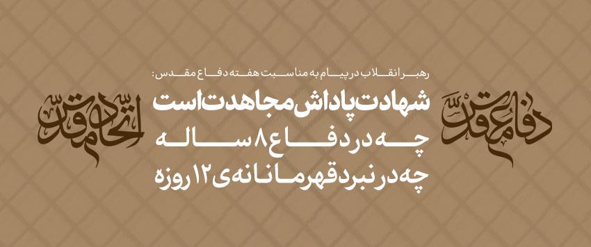 حضرت آیتالله خامنهای رهبر معظم انقلاب اسلامی در پیامی به مناسبت هفته دفاع مقدس و روز «مهمانی لالهها»، شهادت را پاداش مجاهدت دانستند و تأکید کردند که ملتها با این مجاهدتها رشد میکنند و با این شهادتها جلوه و جلا مییابند.